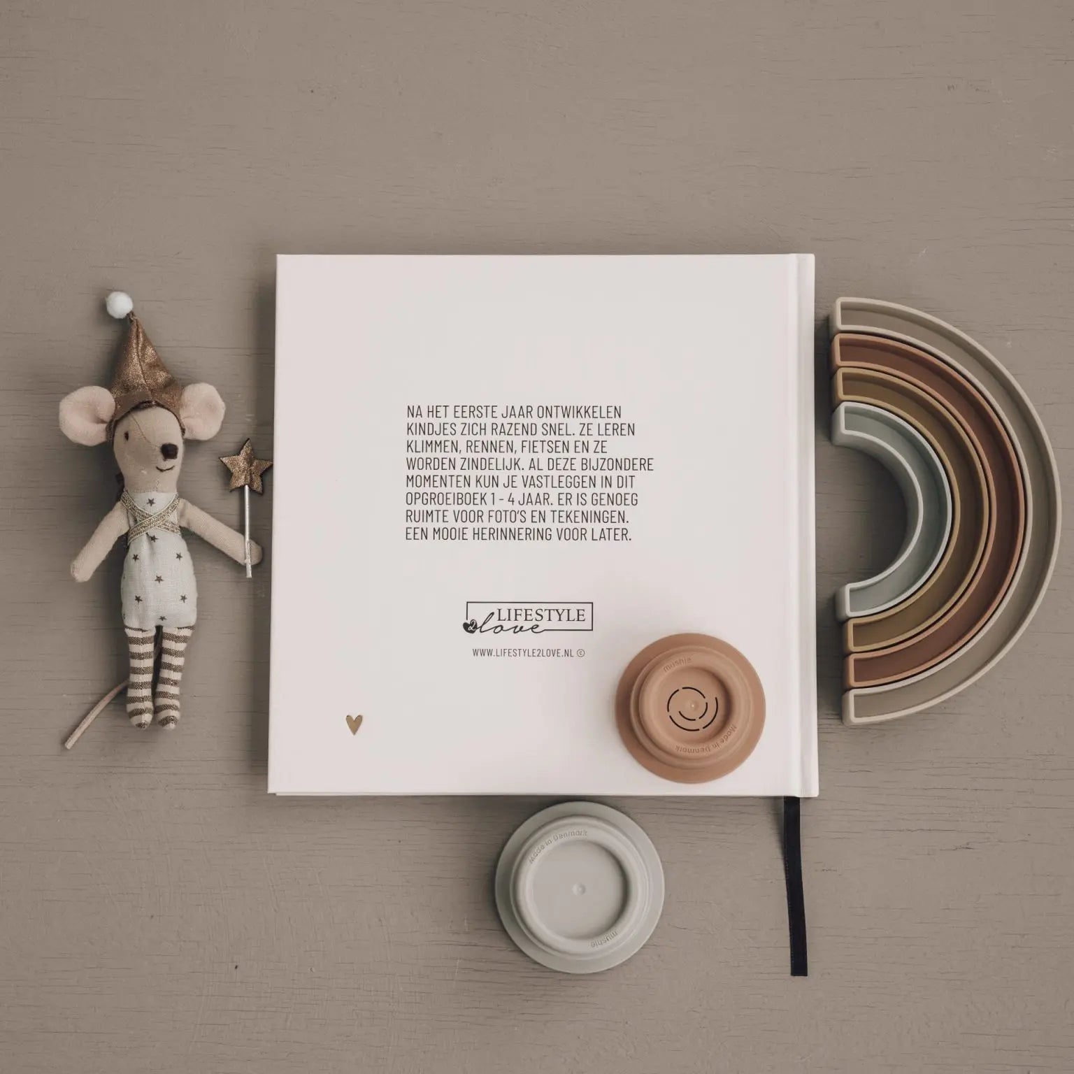 Na het eerste jaar ontwikkelen kindjes zich razend snel. Ze leren klimmen, rennen, fietsen en ze worden zindelijk. Al deze bijzondere momenten kun je vastleggen in dit opgroeiboek van Lifestyle2Love voor kindjes tussen de 1 en 4 jaar. Het Opgroeiboek heeft een harde kaft met goudfolie hartjes. Het boek heeft een zwart leeslint waardoor je altijd weet waar je verder kunt gaan met invullen.
