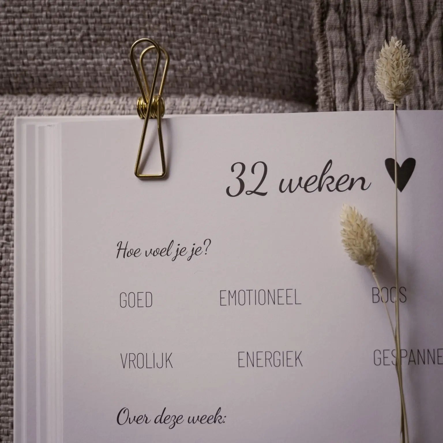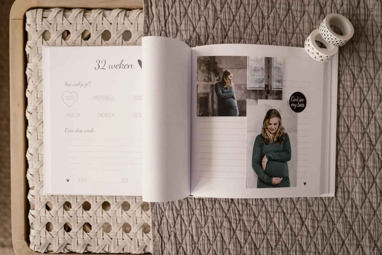 Tussen de weekoverzichten door is er ruimte om foto’s in te plakken. Dit kunnen bijvoorbeeld foto’s zijn van de echo’s, van je groeiende buik of van de babykamer.